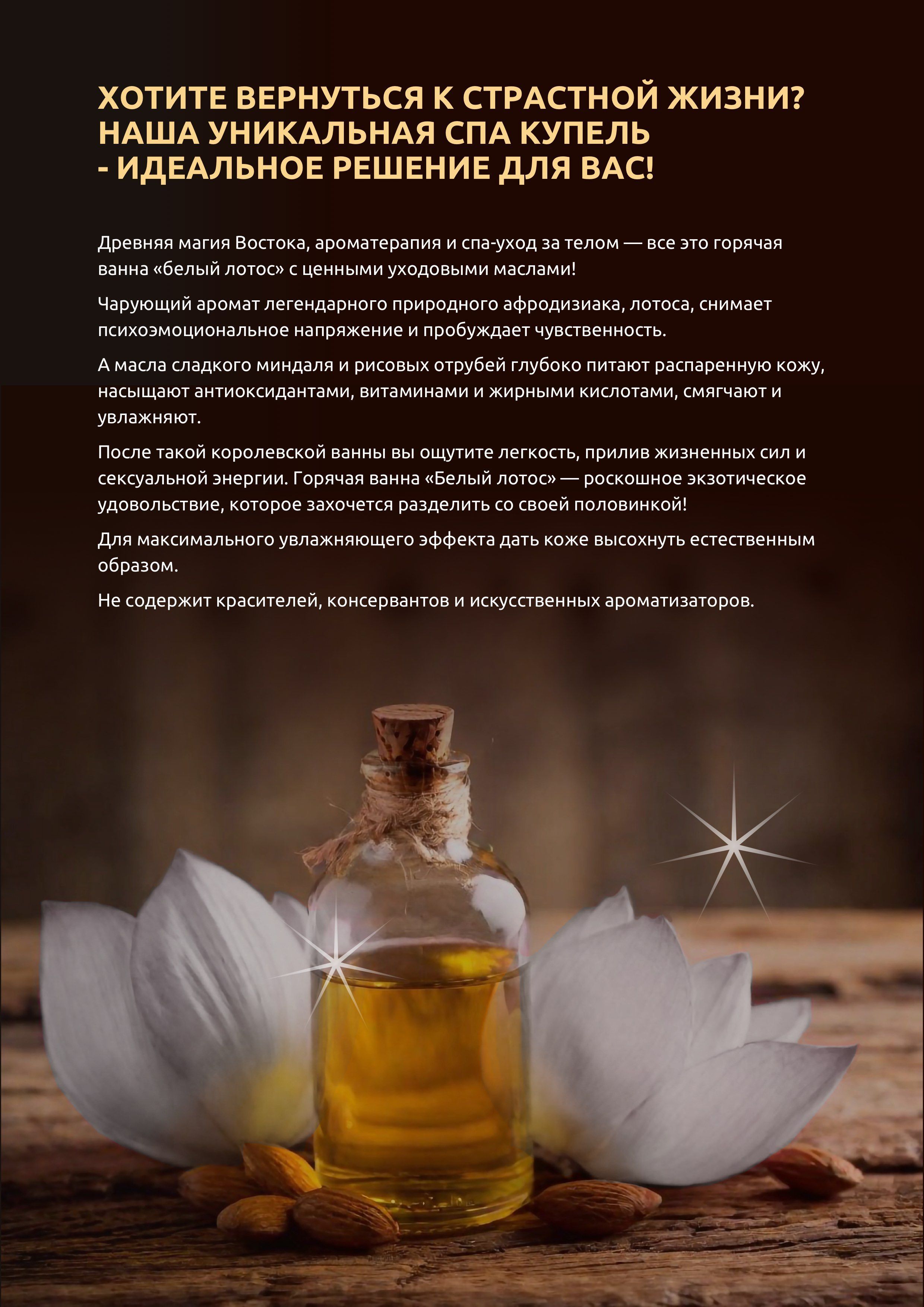 Древняя магия Востока, ароматерапия и спа-уход за телом — все это горячая ванна «Белый лотос» с ценными уходовыми маслами!