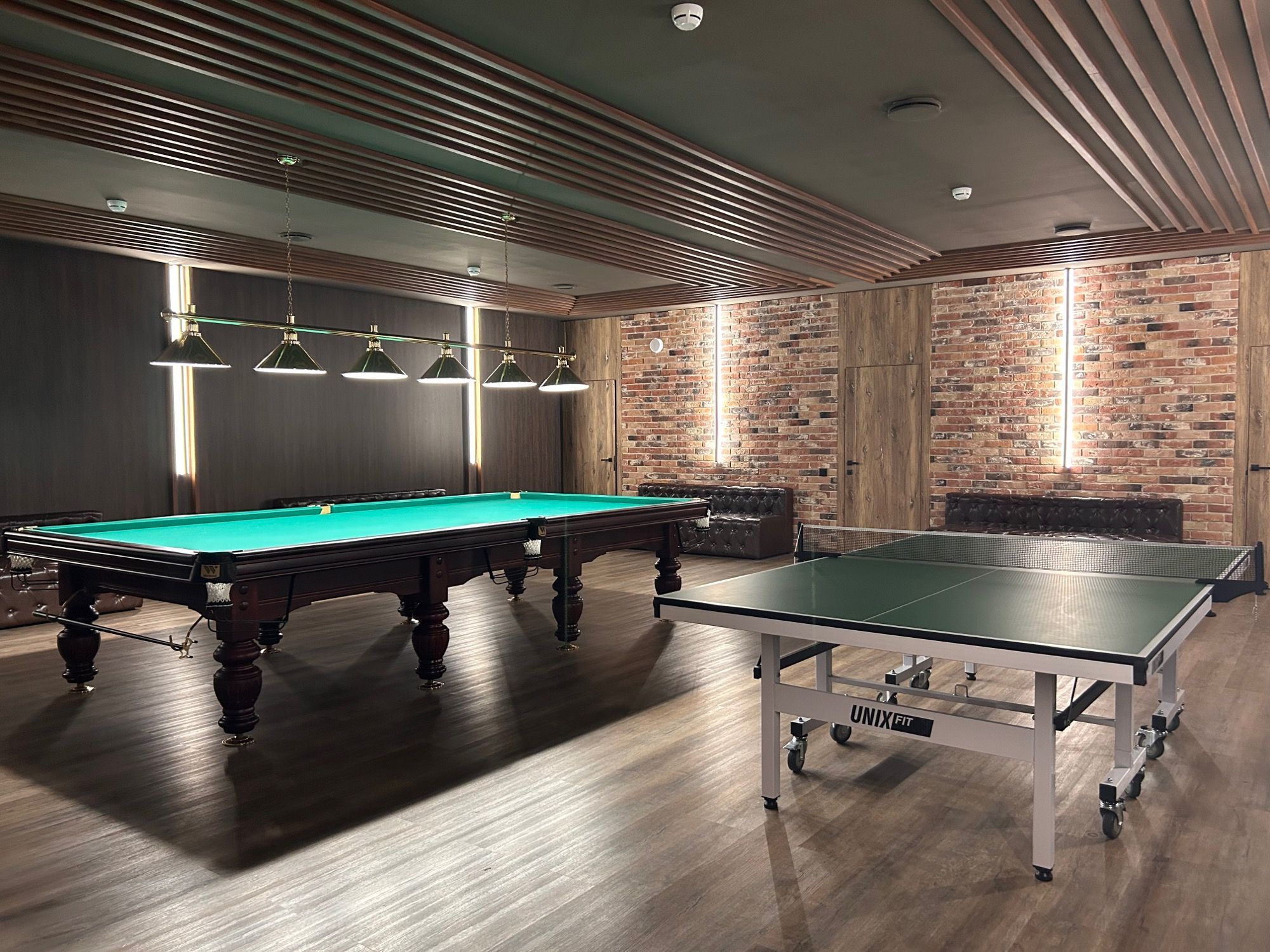 Второй этаж – просторная игровая зона с мягкой мебелью, комнатами отдыха, двенадцати футовым бильярдом и теннисным столом.