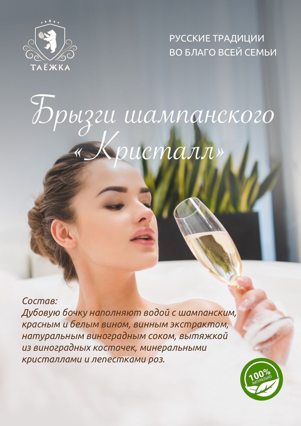 Наверняка, каждый представлял хоть раз купание в шампанском. И вот возможность испытать действие аристократической СПА-процедуры – погрузиться в бочку с игристыми винами и насладиться ей стала реальной. В «Таежных банях» посетителям доступно это удовольствие. Купание будет несрмненно приятным и безусловно полезным. Хорошее настроение и неимоверный прилив энергии гарантированы.
