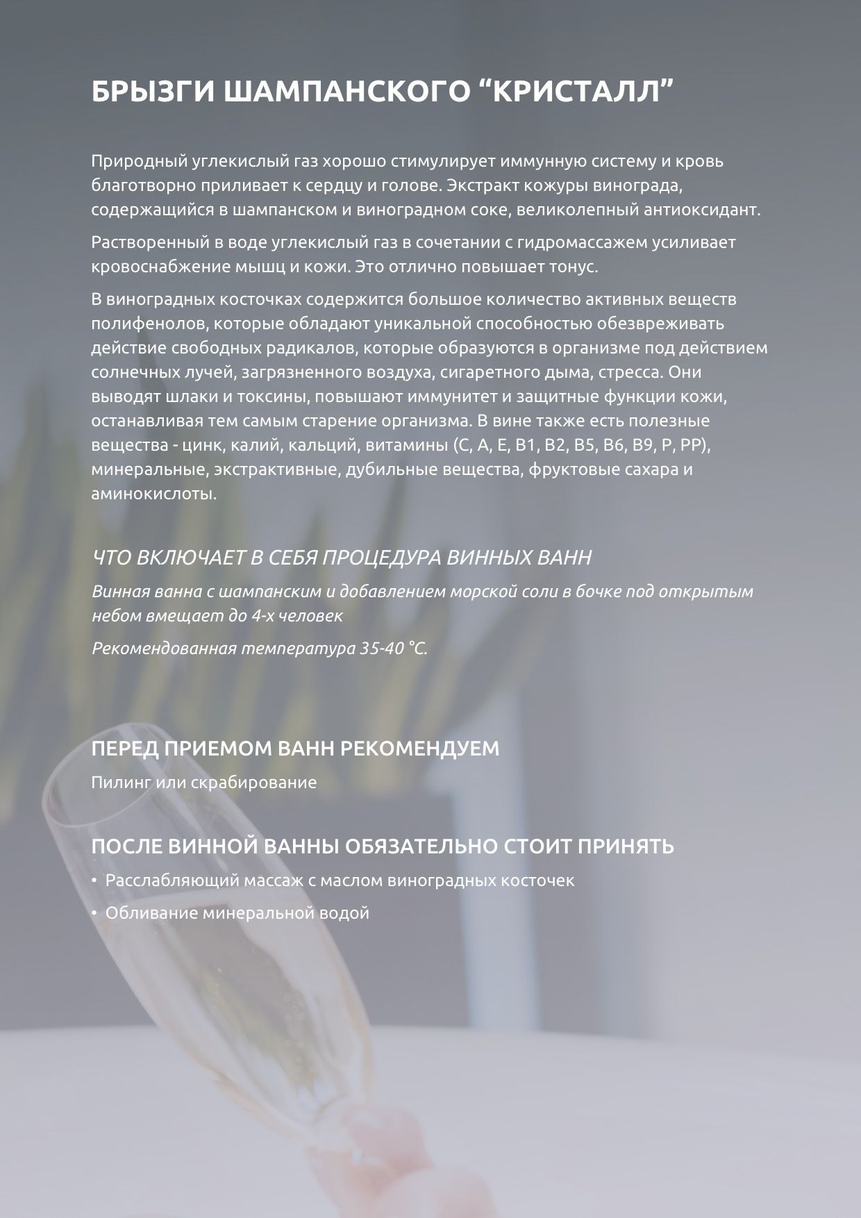 Состав: шампанское, красное и белое вино, разбавленное водой с добавлением винного экстракта, натурального виноградного сока, вытяжки из виноградных косточек. Дополняется минеральными кристаллами и лепестками роз.