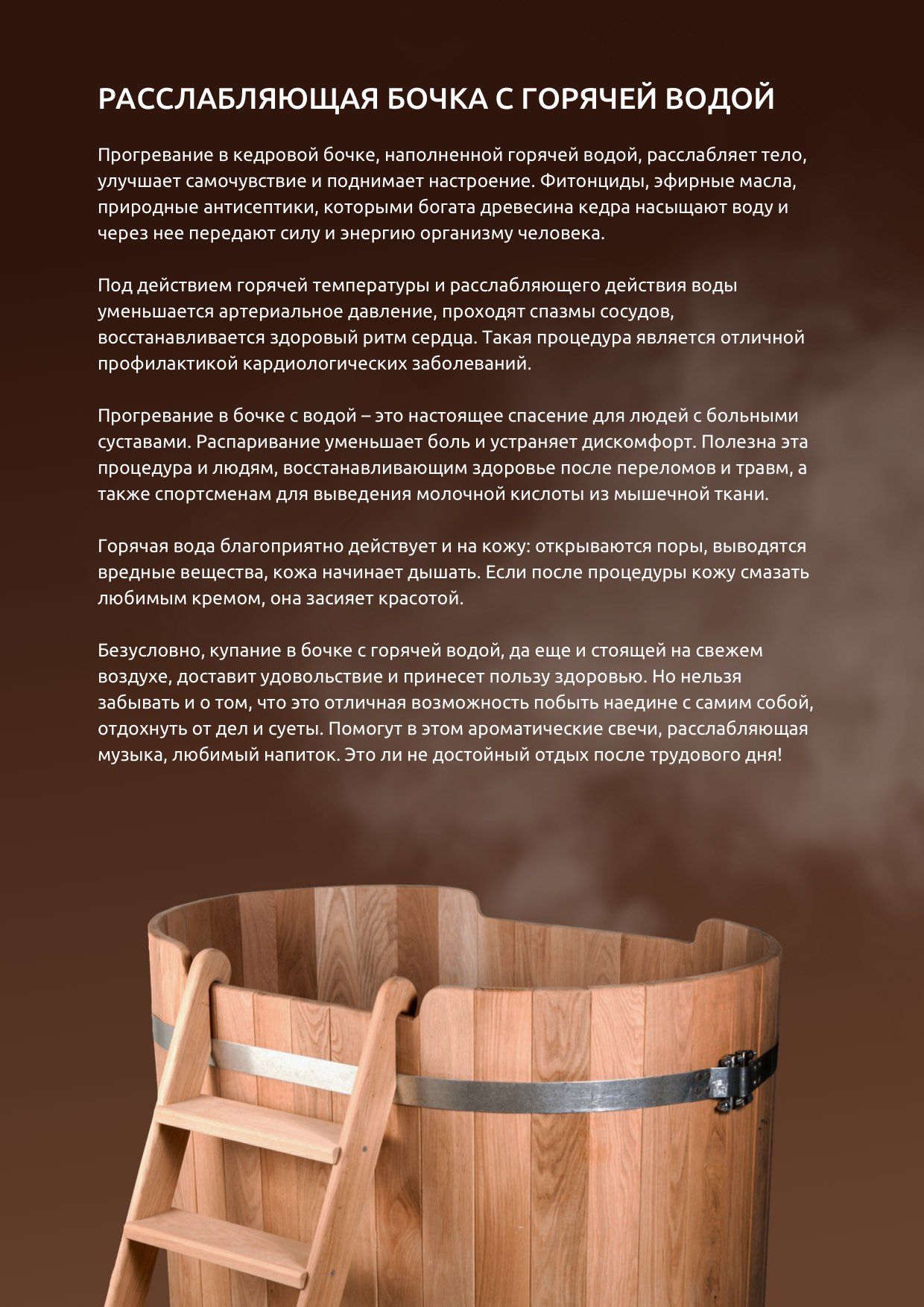 Прогревание в кедровой бочке, наполненной горячей водой, расслабляет тело, улучшает самочувствие и поднимает настроение. Фитонциды, эфирные масла, природные антисептики, которыми богата древесина кедра насыщают воду и через нее передают силу и энергию организму человека.