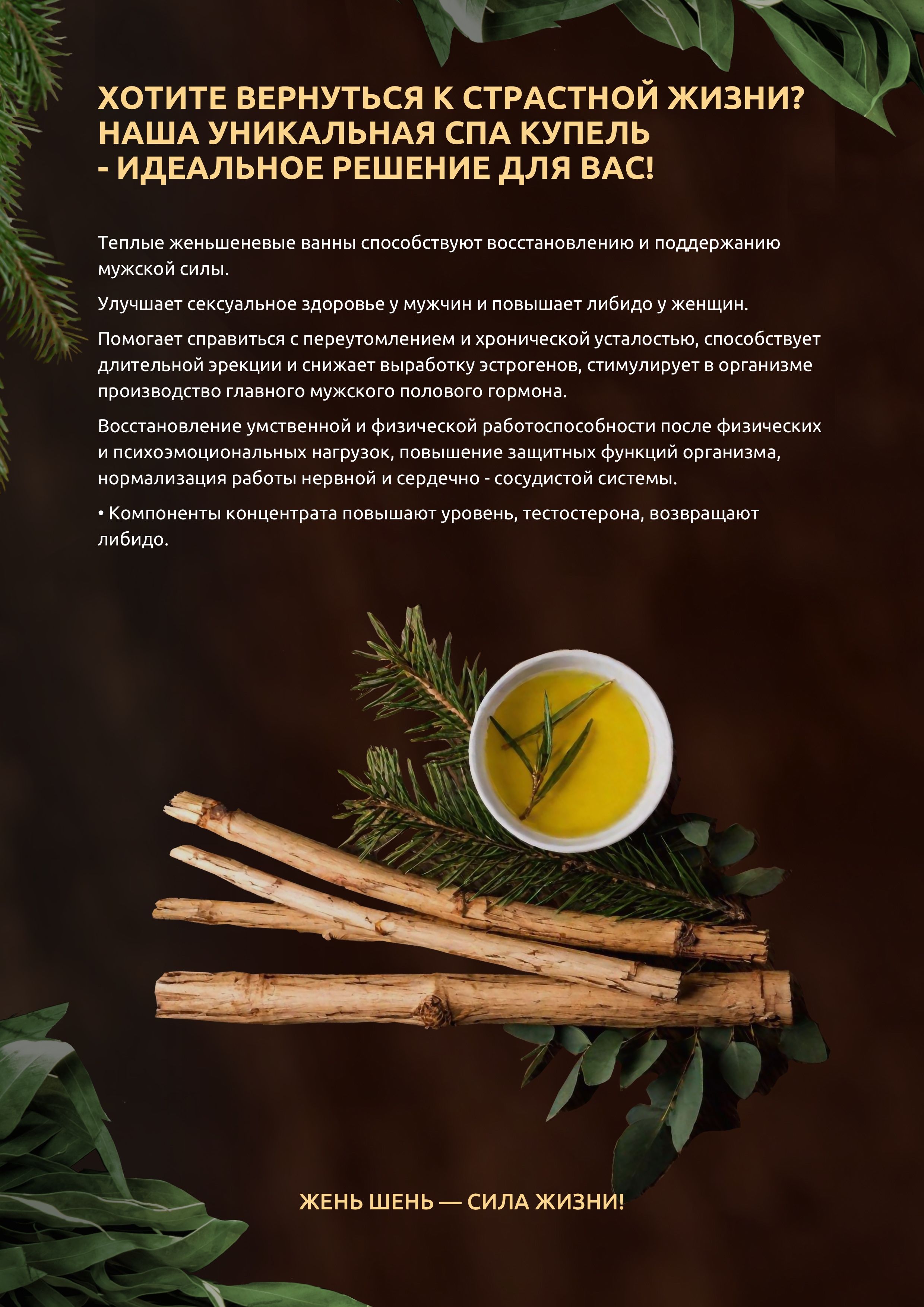Теплые женьшеневые ванны способствуют восстановлению и поддержанию мужской силы. Улучшает сексуальное здоровье у мужчин и повышает либидо у женщин.